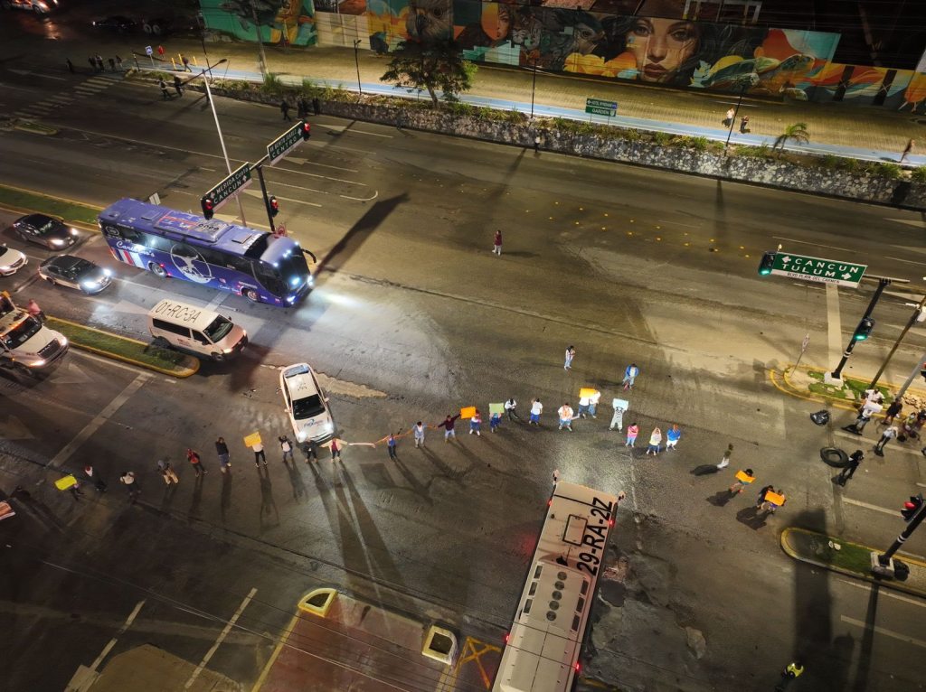Integrantes del asentamiento irregular San Judas Tadeo bloquearon este viernes la carretera federal, a la altura de Centro Maya, en protesta por la vinculación a proceso de su líder, Romeo “N”, acusado por la Fiscalía General del Estado de extorsión y otros delitos de alto impacto.