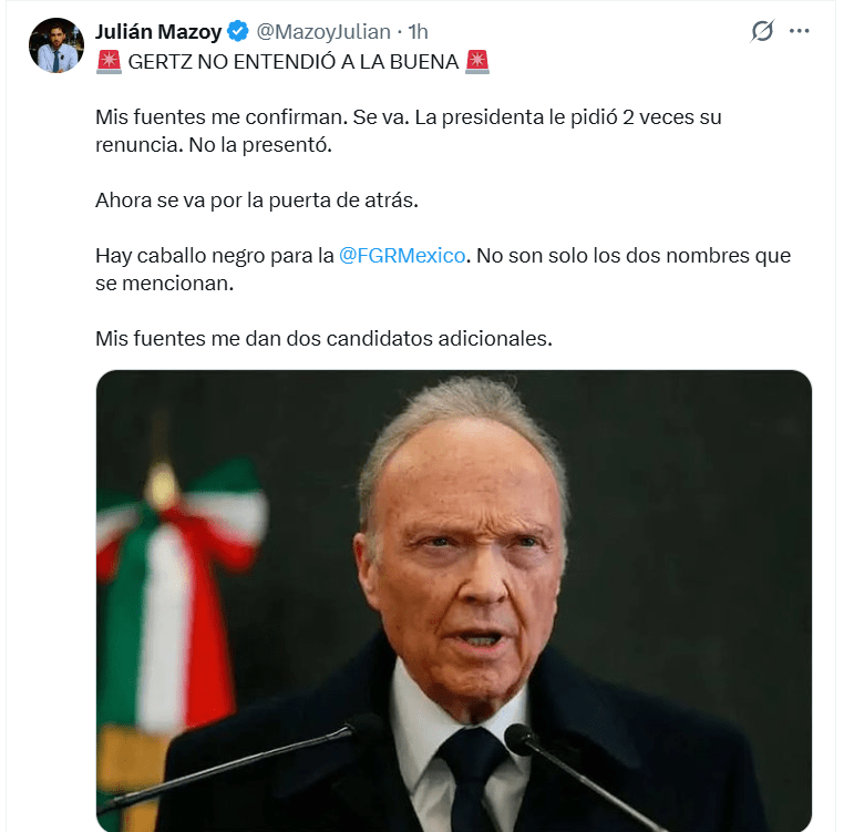 En una jornada marcada por el hermetismo oficial pero por intensa actividad en el ámbito político, diversos periodistas de alto perfil, como Mario Maldonado, Salvador García Soto y Julián Mazoy, difundieron en redes y espacios informativos que el Senado anunciará este jueves 27 de noviembre la renuncia del Fiscal General de la República, Alejandro Gertz Manero.