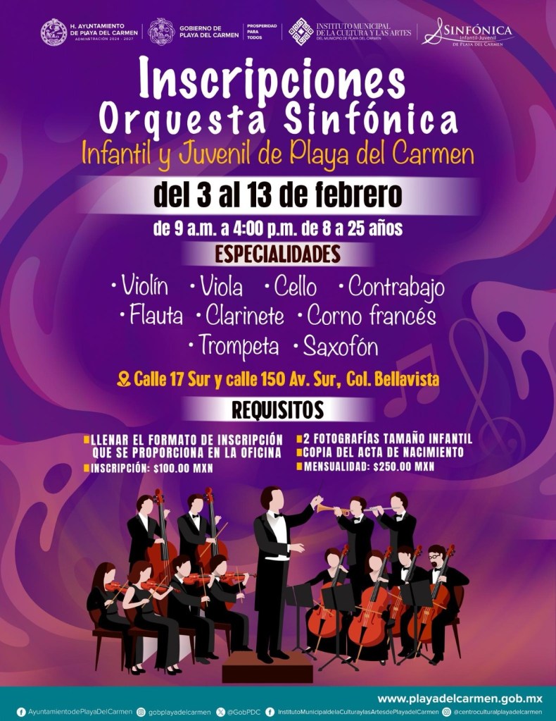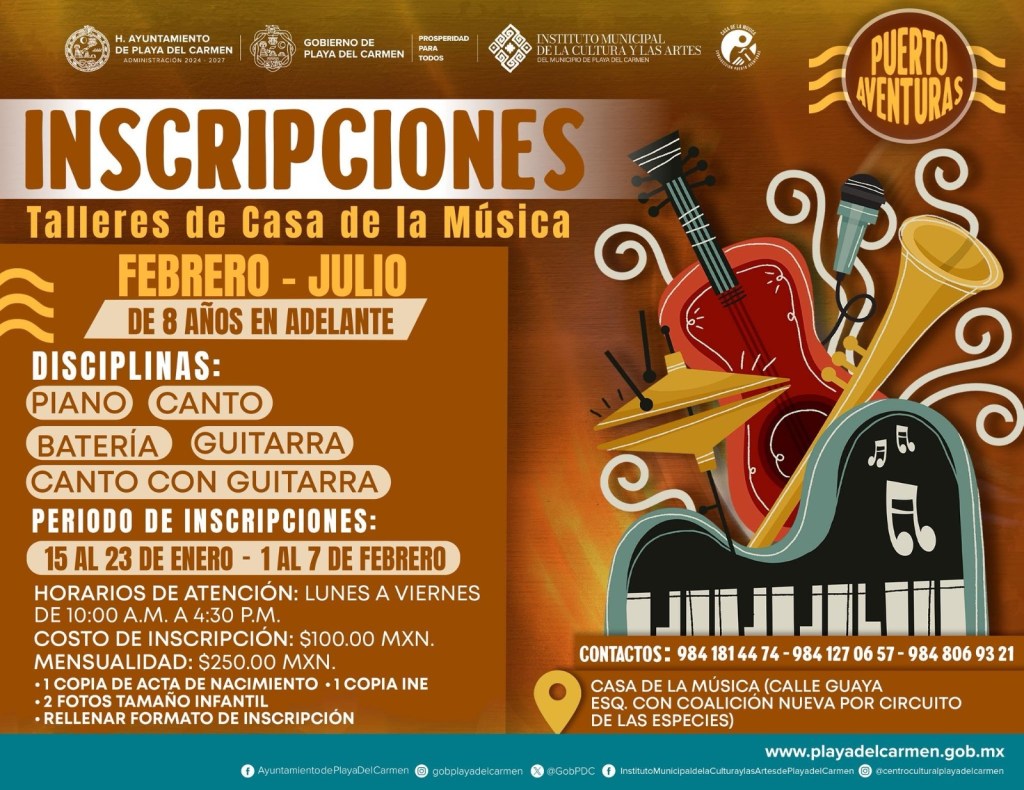El gobierno de la presidenta municipal Estefanía Mercado abrió la convocatoria para integrarse a clases y talleres de música, danza y artes en distintos espacios formativos de Playa del Carmen, con el objetivo de fortalecer el desarrollo cultural de niñas, niños y jóvenes.