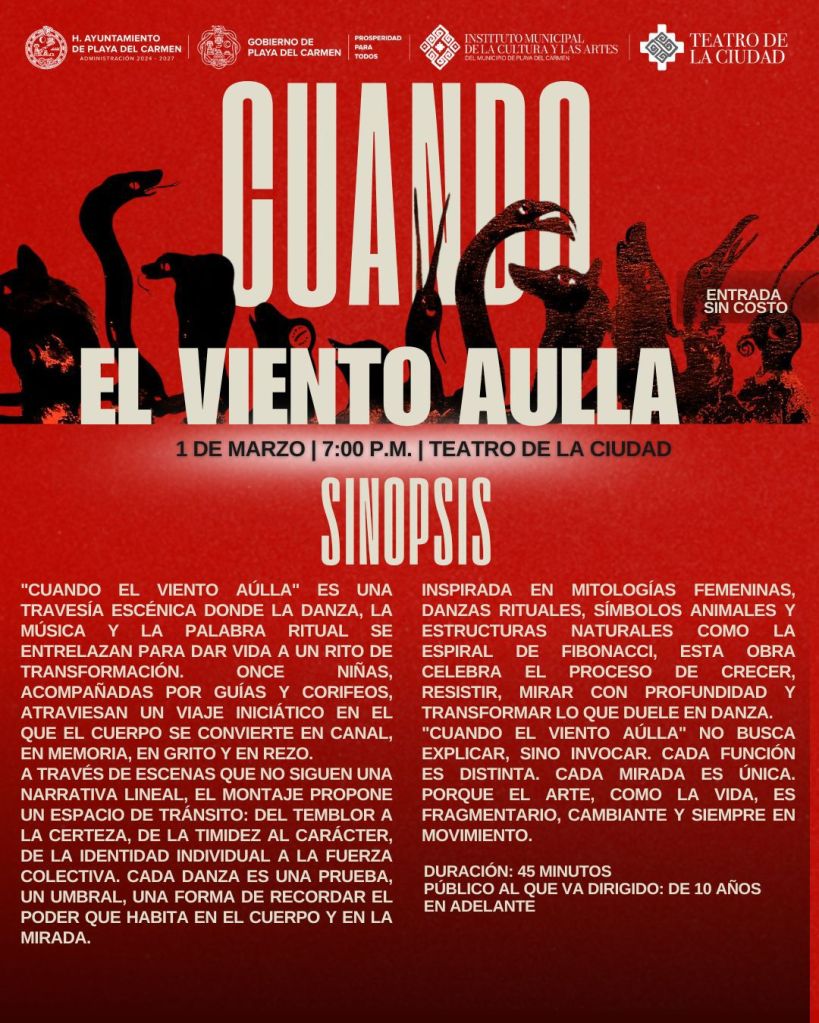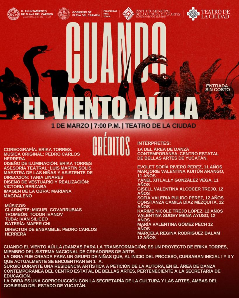 Por su parte, el domingo 1 de marzo a las 19:00 horas, el Teatro de la Ciudad presentará la obra “Cuando el viento aúlla. Danza para la transformación”, dirigida por Erika Torres, integrante del Sistema Nacional de Creadores. La puesta en escena reúne a 10 niñas de entre 10 y 14 años en un ritual contemporáneo donde no interpretan personajes, sino atraviesan procesos simbólicos de transformación.