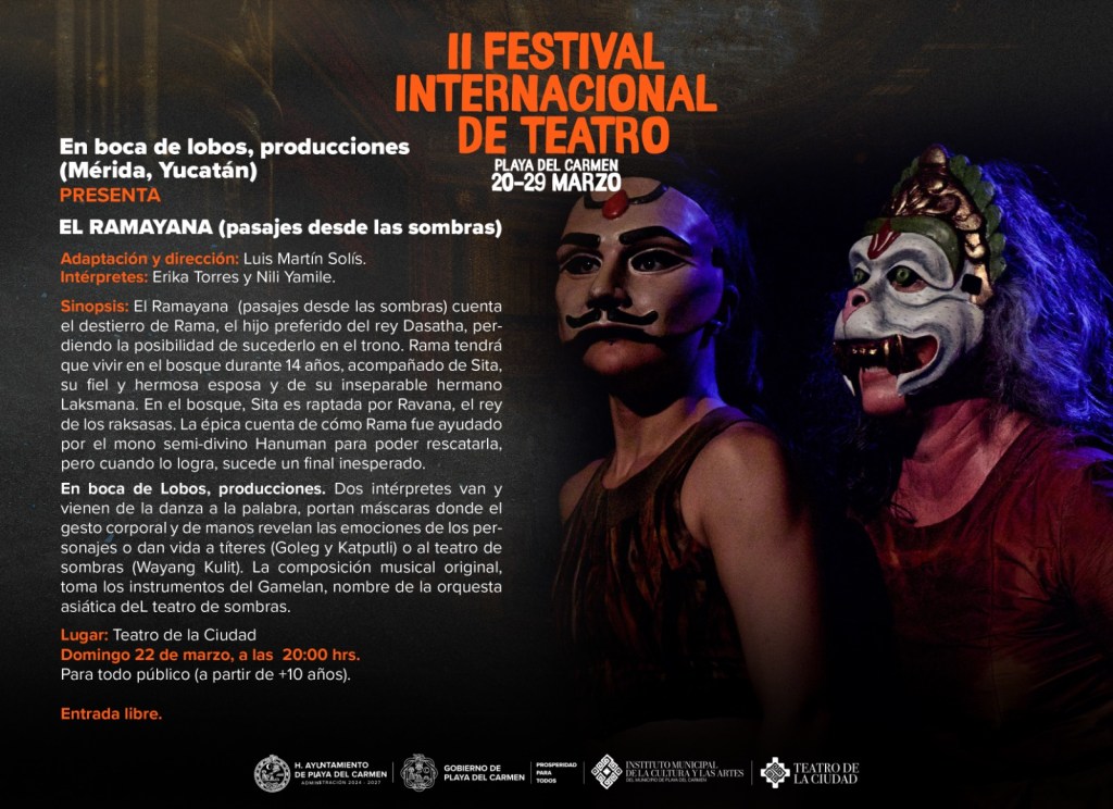 La programación continúa este domingo a las 20:00 horas en el Teatro de la Ciudad con la presentación de “Ramayana de Valkimi (Pasajes desde las sombras)”, dirigida por Erika Torres, integrante del Sistema Nacional de Creadores. La entrada será gratuita y recomendada para mayores de 10 años.