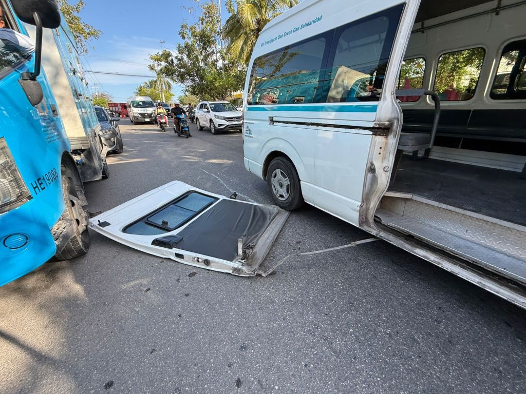 El impacto provocó la caída de los ocupantes del vehículo ligero y fue tal la fuerza del choque que la puerta de la combi se desprendió por completo, arrastrándose cerca de 15 metros sobre el pavimento.